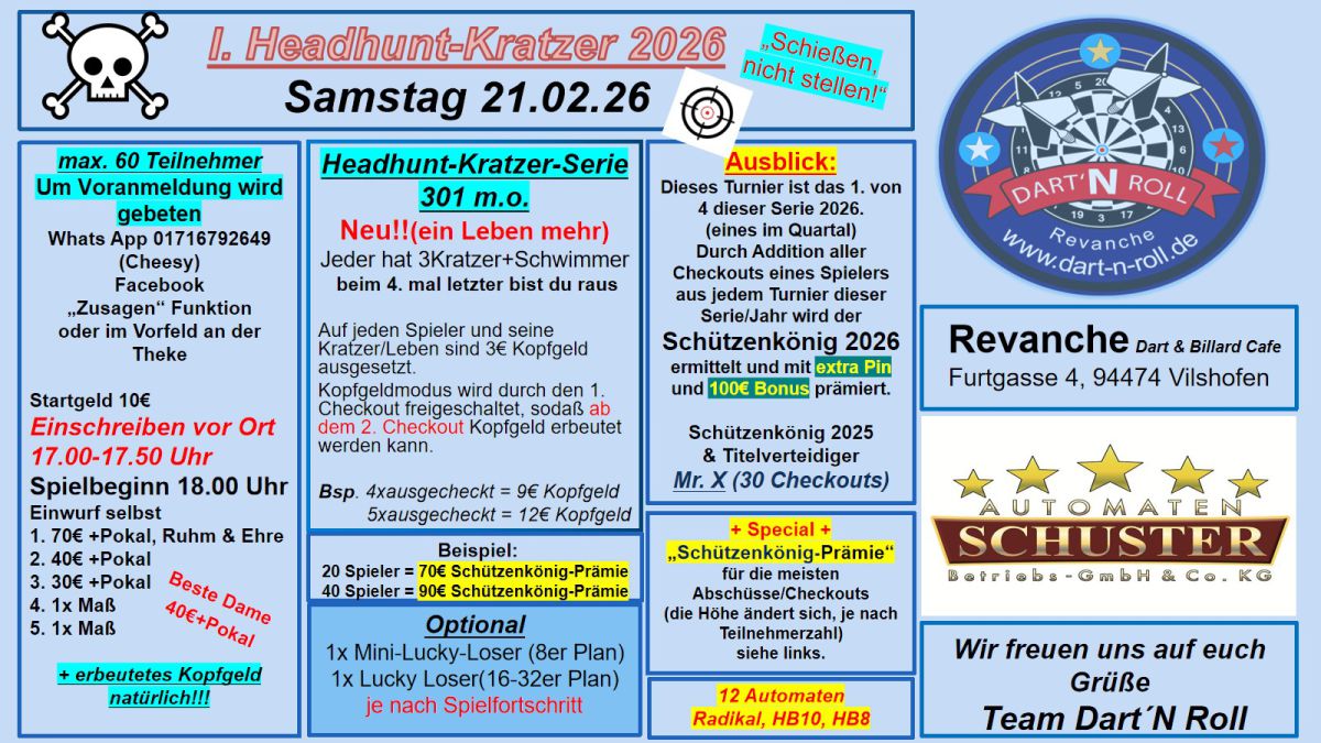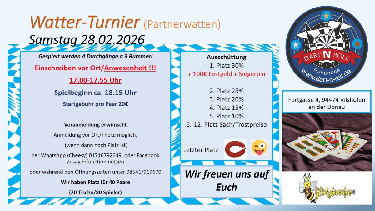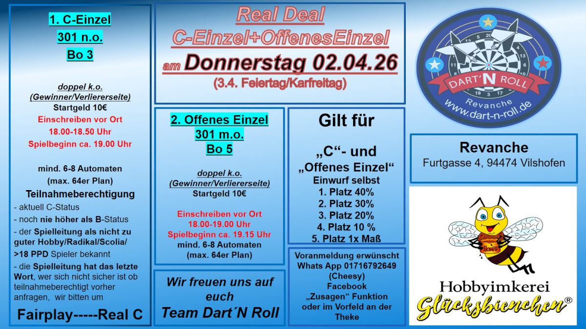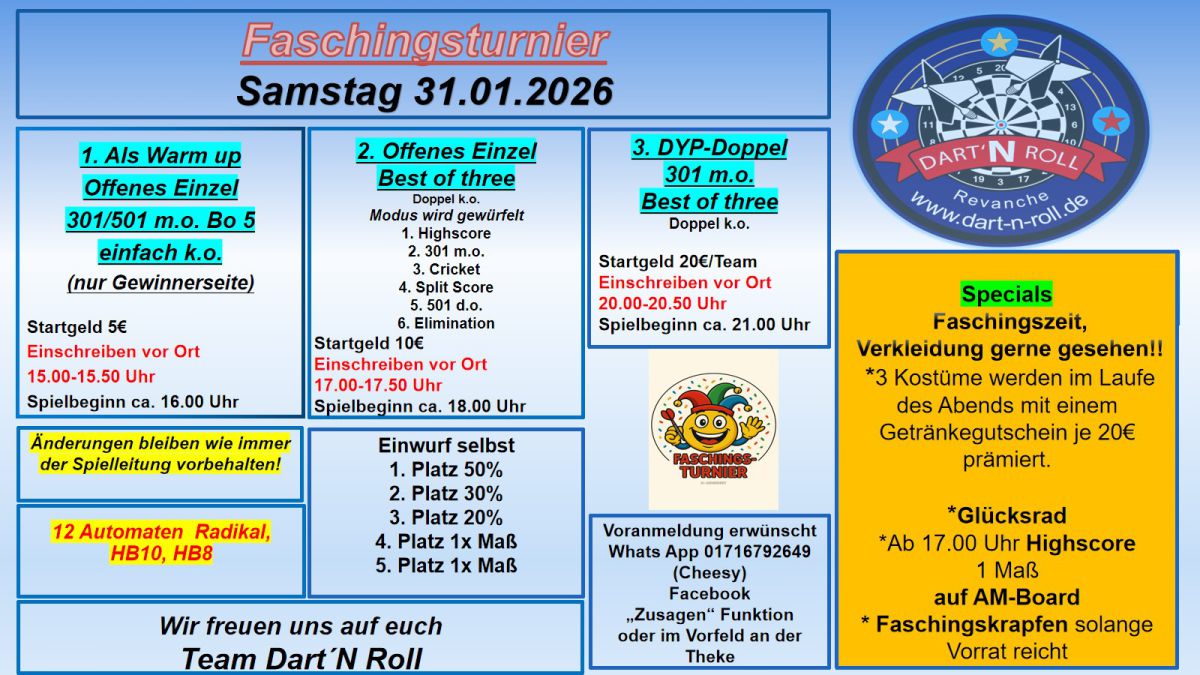 Voranmeldungen zu den jeweiligen Turnieren sind an der Theke per Whatsapp unter 01716792649 (Cheesy) oder Facebook Dart`n Roll mit der Anmeldefunktion "zusagen" möglich. Die angegebenen Zeiten sind aus organisations techn. Gründen bindend.
